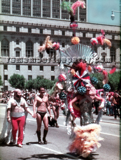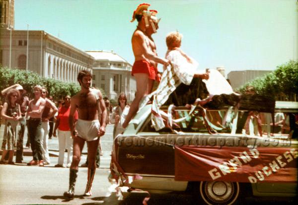 This Mercury Colony Park station wagon is decorated with purple and white ribbons and has "Grand Duchess" on the banner. The duchess herself is regally seated on the roof flanked by two gladiators. Anyone know who this Grand Duchess might be?