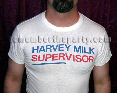 Here the charismatic Christopher is modeling a T-Shirt promoting Harvey Milk for Supervisor. Harvey Milk achieved that position in 1977 after previously running in '73 and '75. We think this shirt dates from '77