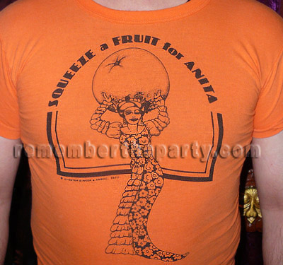 This 1977 shirt invites us to squeeze a fruit for Anita! In that same year Anita Bryant had a fruit pie thrown in her face at a press conference. That night people held pie parties all over San Francisco! I knew there was some reason for me loving pie so much!