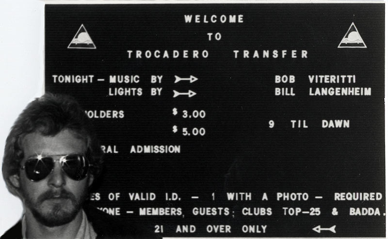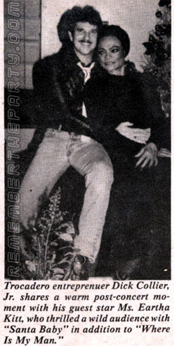 The lovely Eartha Kitt onstage at the Troc New Year's Eve 1983. She was carried onstage by two muscle men much to the crowd's delight. Eartha performed Santa Baby and her brand new hit Where Is My Man co-written by Bruce Vilanch. Upper right in the DJ booth is Dick Collier in the pink tie and manager David Caruso. The DJ that night was Mike Lewis who played BearEssense's The Big Hurt immediately after Eartha's set.