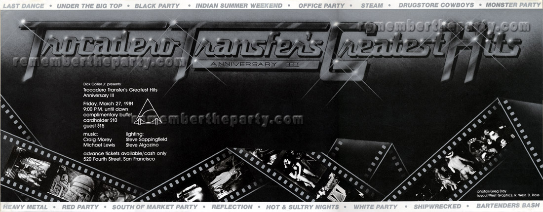 This is a great poster for the Troc's 3rd anniversary. The graphics show scenes from previous parties and even lists them on the upper and lower edges. We have images and stories from some of these parties like the Shipwrecked Party and Bartender's Bash, but some of those party names look very intriguing and must have been a lot of fun. The double entendred name of "Under The Big Top" must have elicited some interesting costumes!