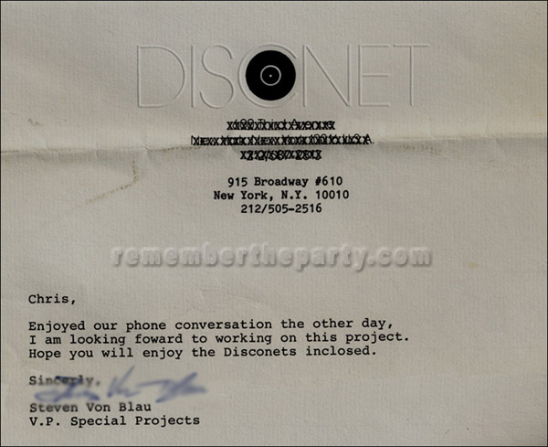 In this section, we will also be adding bits of memorabilia that were part of the time period that Remember The Party celebrates. This is a note from Steven Von Blau, V.P of Disconet's DJ record remix pool's special projects. He is referring to RTP co-producers Chris and Bob's imminent record release on Moby Dick Records. Chris and Bob a.k.a. BearEssense, were poised to release "The Big Hurt." with Marianna on vocals. Disconet created a long remix and re-edit of the Big Hurt helping it become a hit at the Saint in New York.
