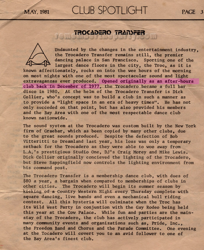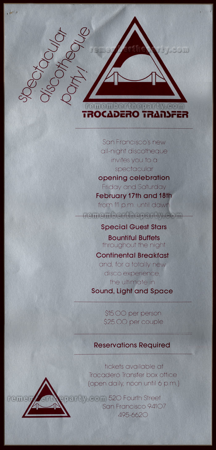 This is the Trocadero Transfer's grand opening celebration poster from February 1978! The club opened as a juice bar after hours disco club in December 1977. Dick Collier then waited almost three months before having this, the first big splash all night event with special guests, buffets and breakfast. It would be another two years before he would secure a liquor license.