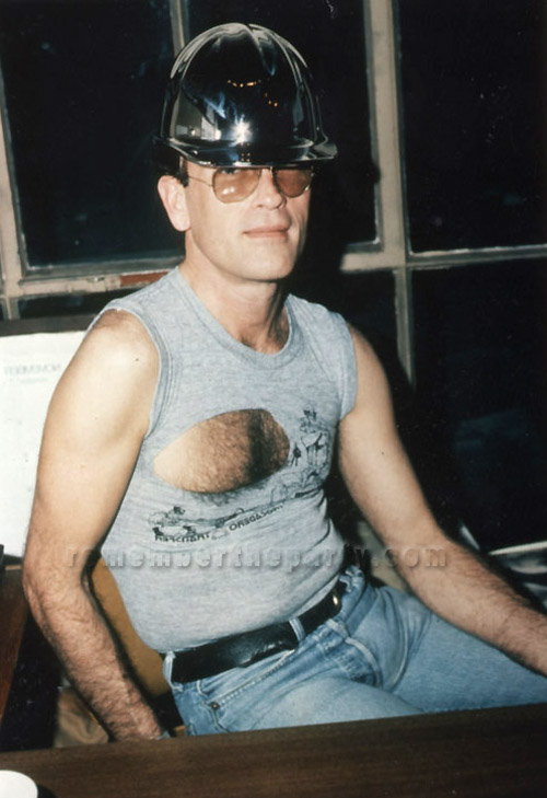 Here, we see Douglas sitting in the membership office. Douglas looks très butch in his construction worker outfit. His image could vary from day to day. A favorite memory for some is going in to the office and seeing Douglas sitting behind the desk, hair in pin curls with bobby pins and a turban. If a partygoer was having a "bad time", they could go and visit with Douglas where he would take out his lovely jewelry box and show them sparkly brooches and rings to take their minds off the "bad time". Soon they'd be out dancing and having a good time again.