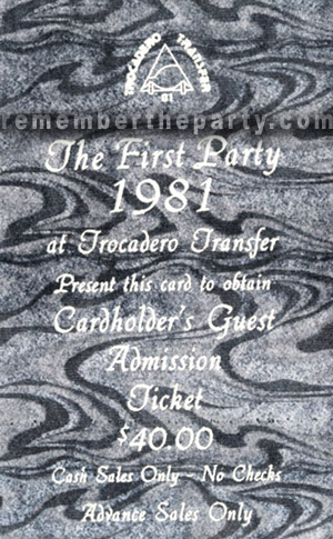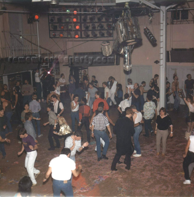 This is a rare view of the Troc Dance floor. The debris on the floor indicates that this is early morning after a White Party. Note the smattering of white clothing and white wristbands. The sparse amount of dancers would suggest the last few songs of the morning are being played. Check out the new pole by the alley exit with the tubular lights by Miss Carla. The rather phallic mirror cylinder with ball hangs enticingly in this corner over the crowd - more of Unit's chachkas!