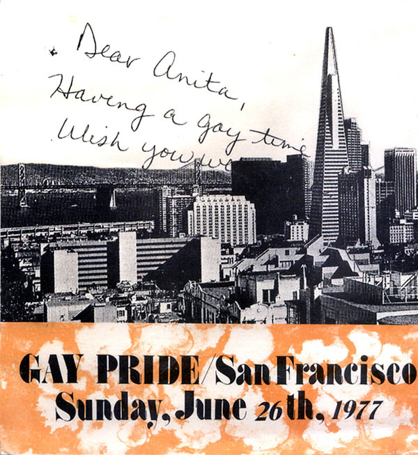 San Francisco Gay Pride 1977, this person must have been writing a little greetings card to Anita Bryant. Too bad the last words are not visible. Do they say "wish you were here? queer? dead? I guess we'll never know for sure.
