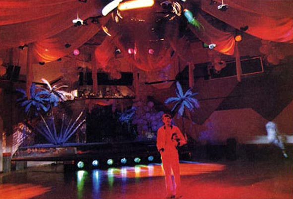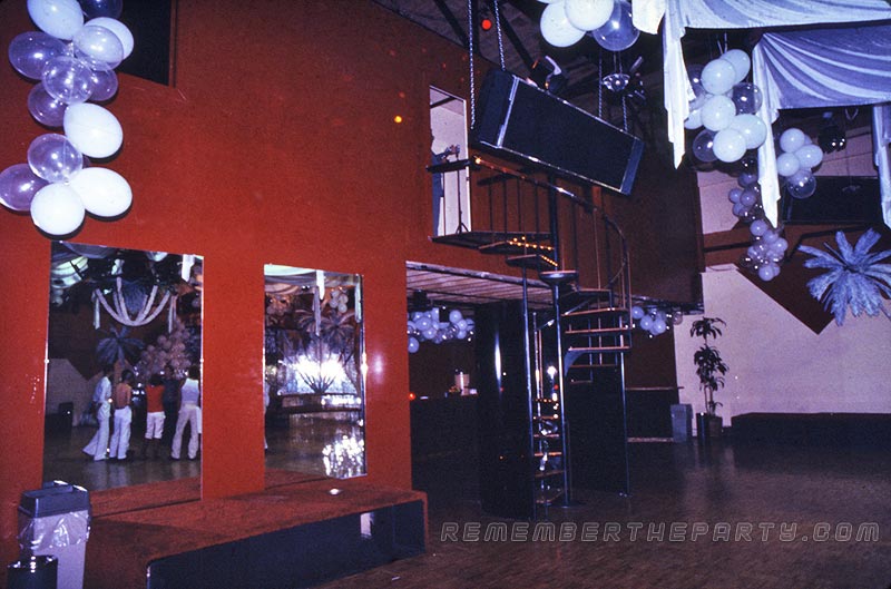 It's March 1978, the club had opened in mid December of '77 with no liquor license and was only serving soda and juice. Here we see the club all dressed up for the White Party. Notice that the famous mirror ball cluster is not yet in place. The center display is a carousel of spotlights with rotating color wheels. Rumor has it that this was originally used for a Rolling Stones concert at Madison Square Garden.The clubs lighting system was designed by Phoebus Lighting and the Graebar sound system had 12,000 watts of distortion free sound.