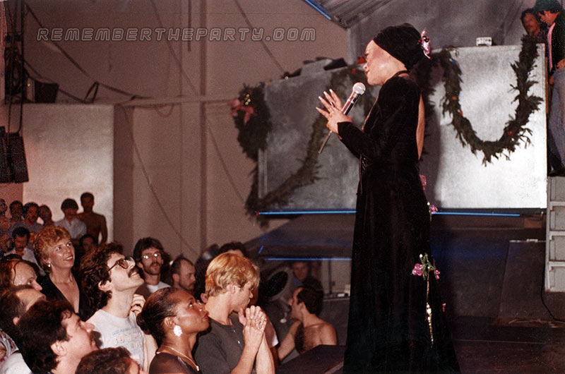 The lovely Eartha Kitt onstage at the Troc New Year's Eve 1983. She was carried onstage by two muscle men much to the crowd's delight. Eartha performed Santa Baby and her brand new hit Where Is My Man co-written by Bruce Vilanch. Upper right in the DJ booth is Dick Collier in the pink tie and manager David Caruso. The DJ that night was Mike Lewis who played BearEssense's The Big Hurt immediately after Eartha's set.